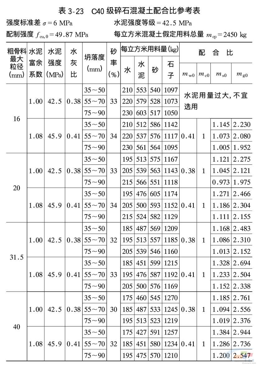 C40级碎石混凝土配合比参考表(使用42.5水泥)